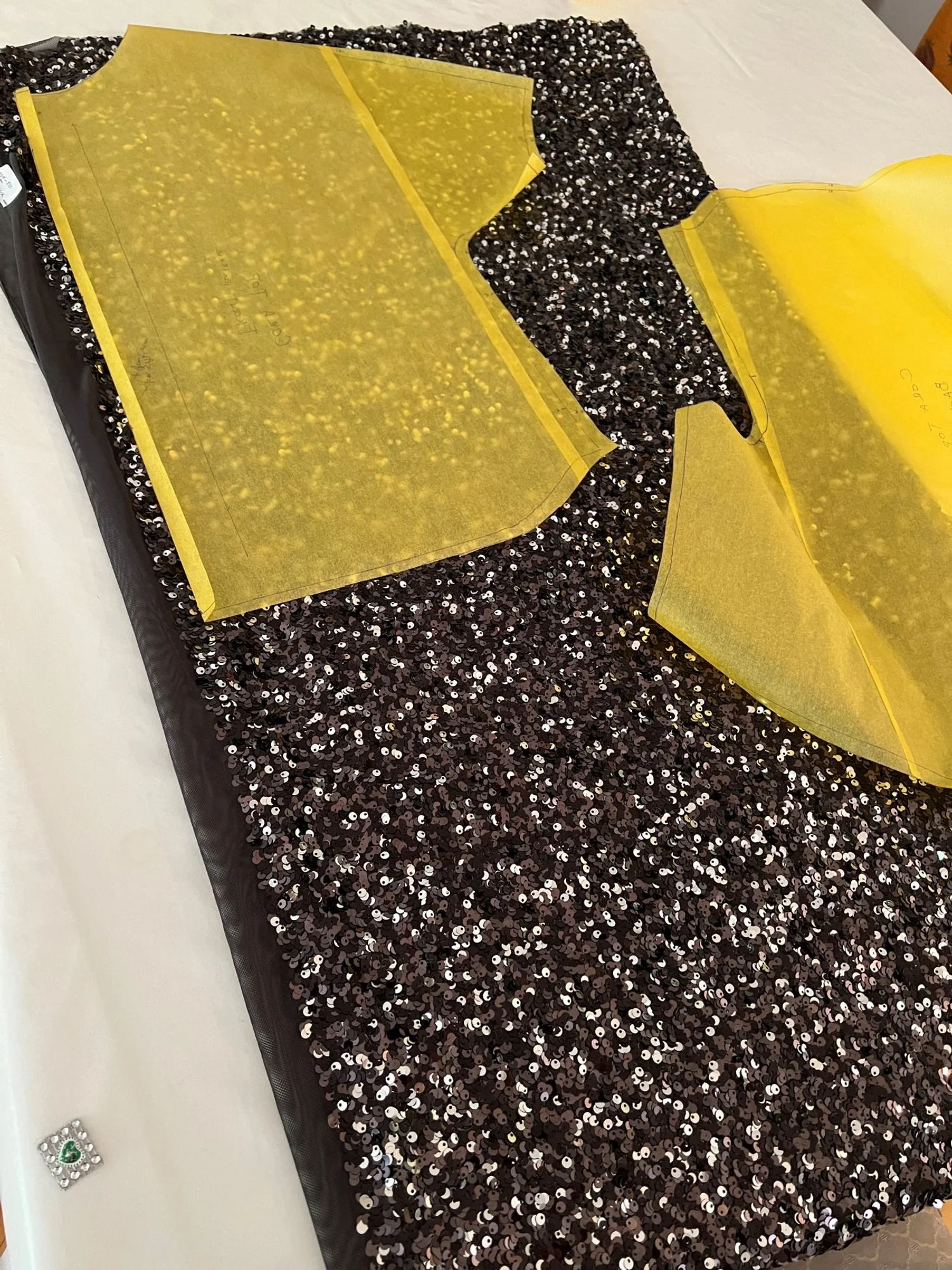 Sewing this didnt have to be much, there is no way the stitching will show! I tacked it together then cut off sequins here & there if they got in the way, then hand sewed it sandwiched between some satin bias strips, tehn turned the seam to the back and hand sewed that down